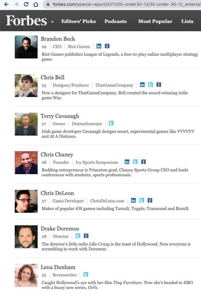 Some common questions: I didn't try to get on it (it was the first one, they contacted me), and I didn't pay to be on it. It's unrelated to net worth. There are 12-20 categories of 30 people yearly for 13 years, so ~6,000 people by now.The age cutoff does not mean you must achieve big things by 30 or it's too late. Think kid's division - if you take the age cap off many people older than 30 do bigger things than what non-celebrities on the list did. Like how a musician may be good for a 13 year old, but there are still many better adult musicians.Today many people have strange ideas about this list and people on it. I bring it up only because in some circles it helps me reach more people by getting a stranger to give my work or experience a second look.Some people write clickbait that gets reshared by playing to anger over a handful of 6,000 people ever on the list who turn out to be outright criminals. I've met dozens of people through the related networking events over the years, the majority are kind and normal. Most are middle class.I've also seen frustration about it being an open application process. I believe that was an improvement over the earlier system, in which it was harder for someone to come up for consideration if the category judges hadn't heard of them.Games didn't have a category our year, so I and 5 other game developers were in Entertainment alongside athletes and celebrities, leading my brother to jokingly introduce me to people as "the LeBron James of making videogames."